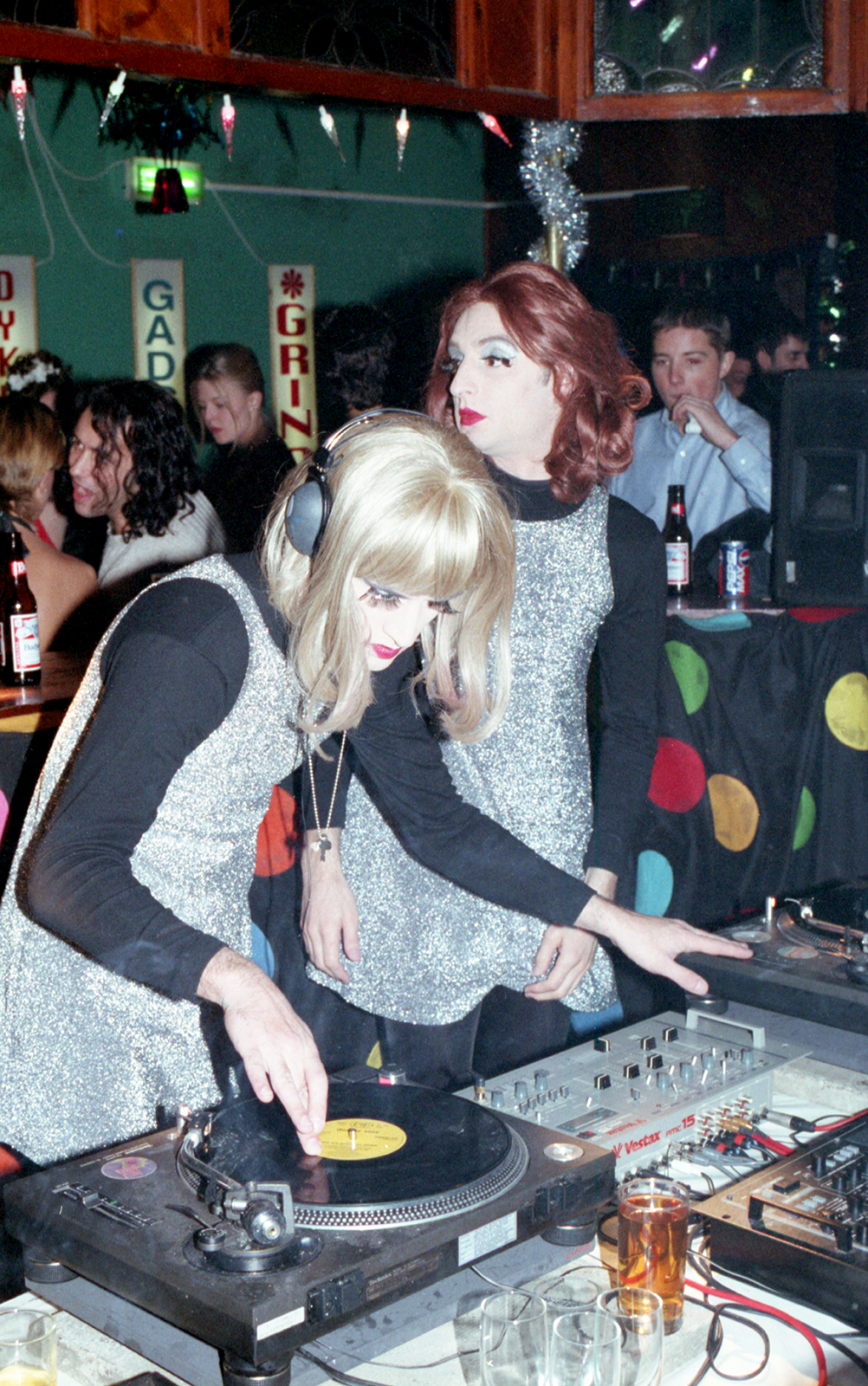 * TWA at Vague, Leeds, 1994 depicts the DJ duo Trannies With Attitude who regularly played at Vague club in Leeds. As the name includes an outdated term that is now considered a slur and to be offensive, we have made the decision not to use it in exhibition material.