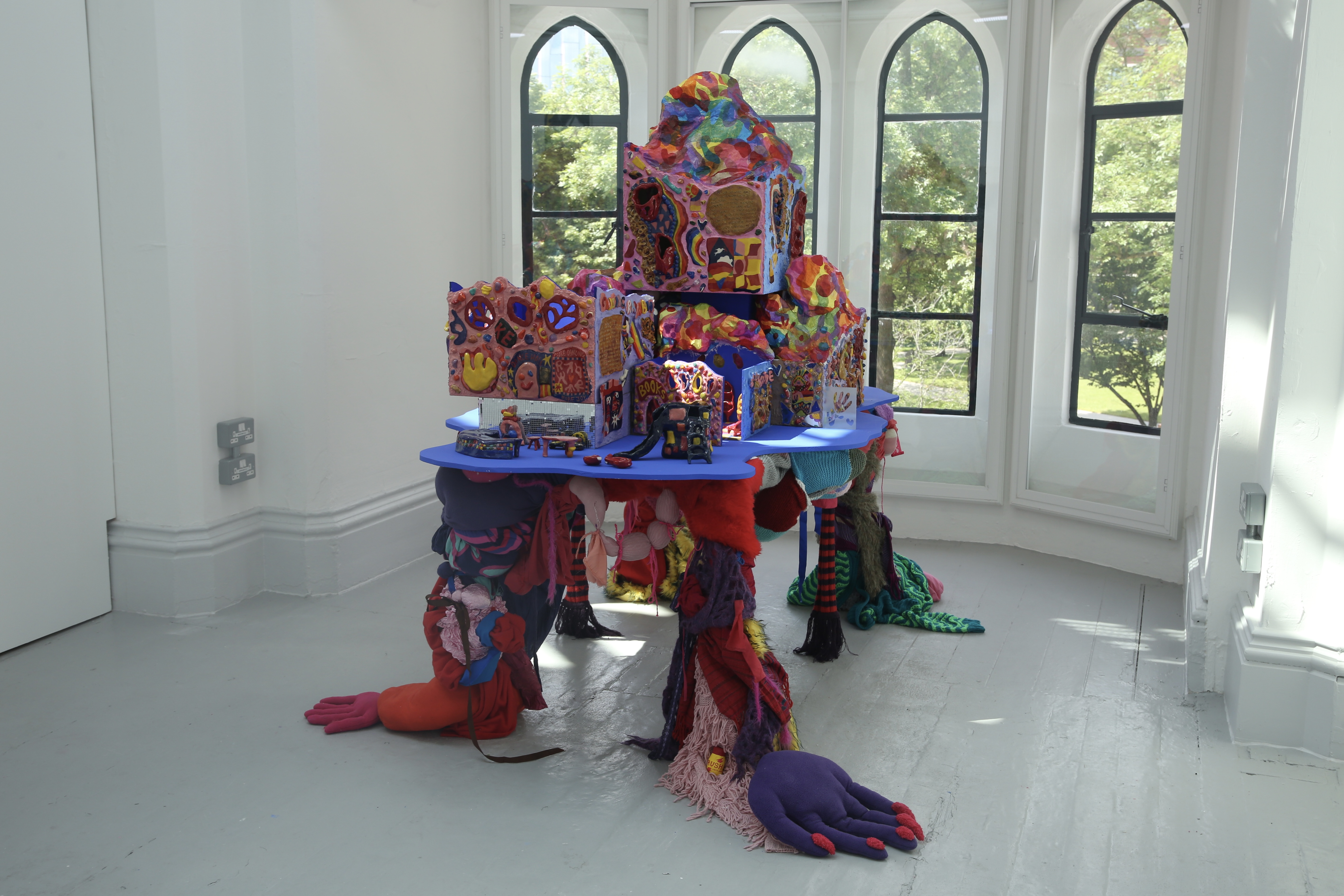 Ellie Blundell’s playful sculptures and ceramic works transform everyday objects into joyful explorations of queer identity and history. Inspired by queer craft traditions and abstraction, Ellie’s work often draws from the AIDS Memorial Quilt, preserving the memories of lost queer voices while envisioning a vibrant, hopeful future. Their use of dynamic forms and colour celebrates fluidity and connection, crafting inclusive spaces for storytelling and imagination.